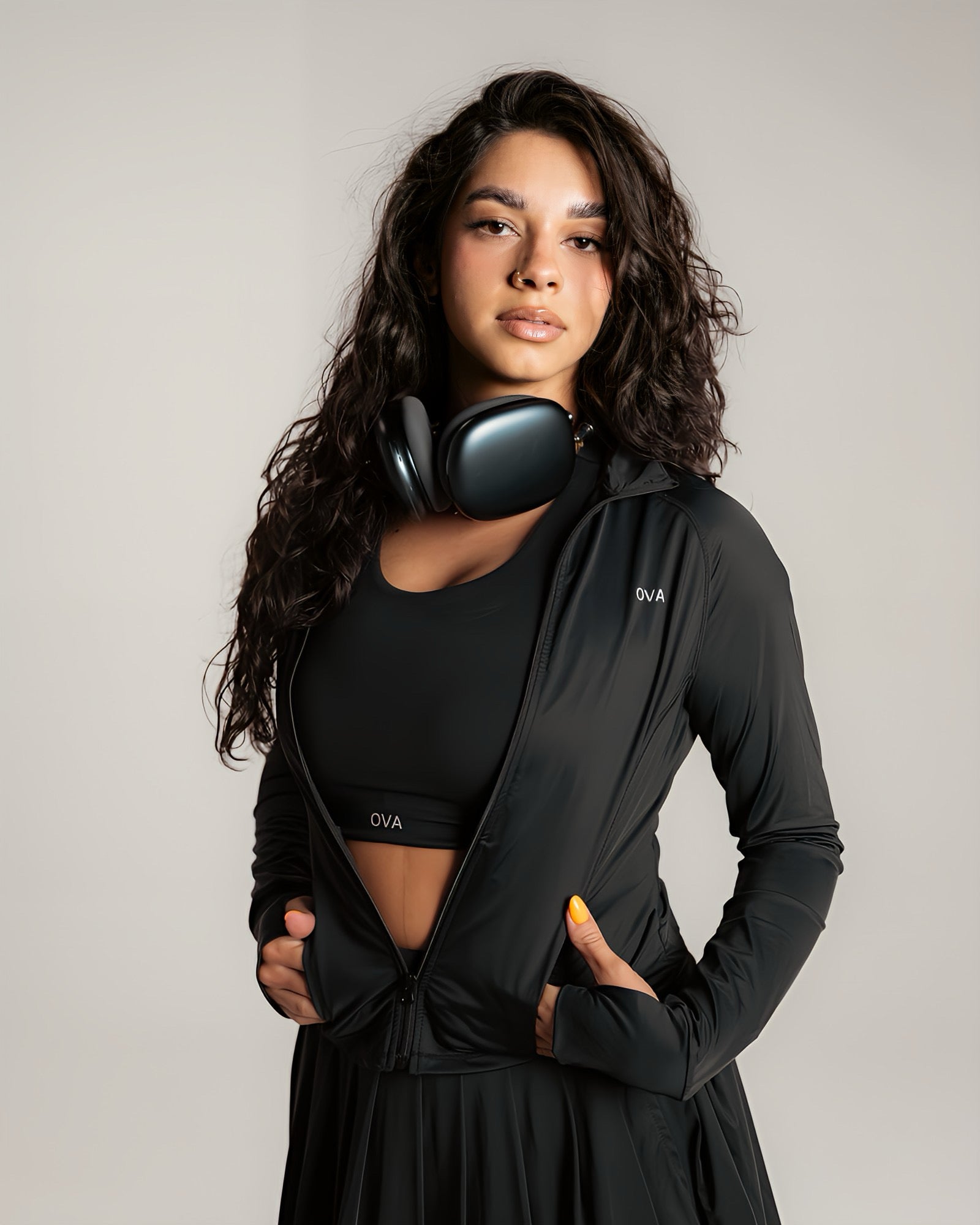 The Harmony 3-Piece Skirt Set features a lightweight cropped jacket, a supportive bra top, and a flowy skirt-short designed for effortless movement and feminine strength.